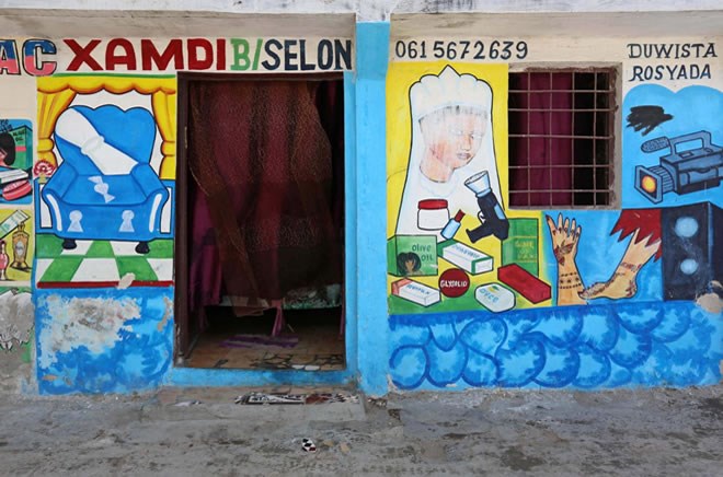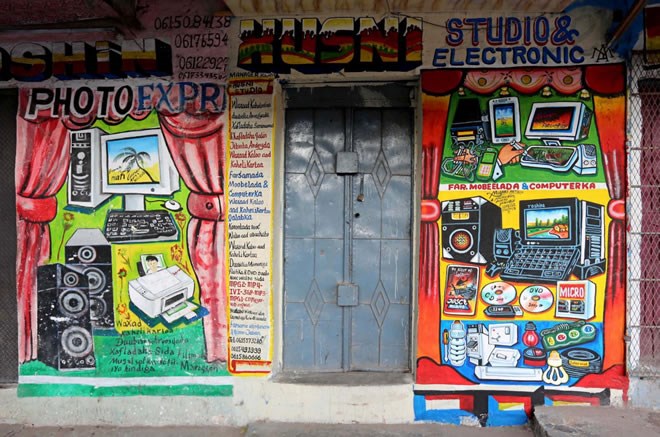 A mural on a shop front illustrates electrical appliances in Wabari district of Mogadishu, Somalia, June 8, 2017. Reuters/Feisal Omar