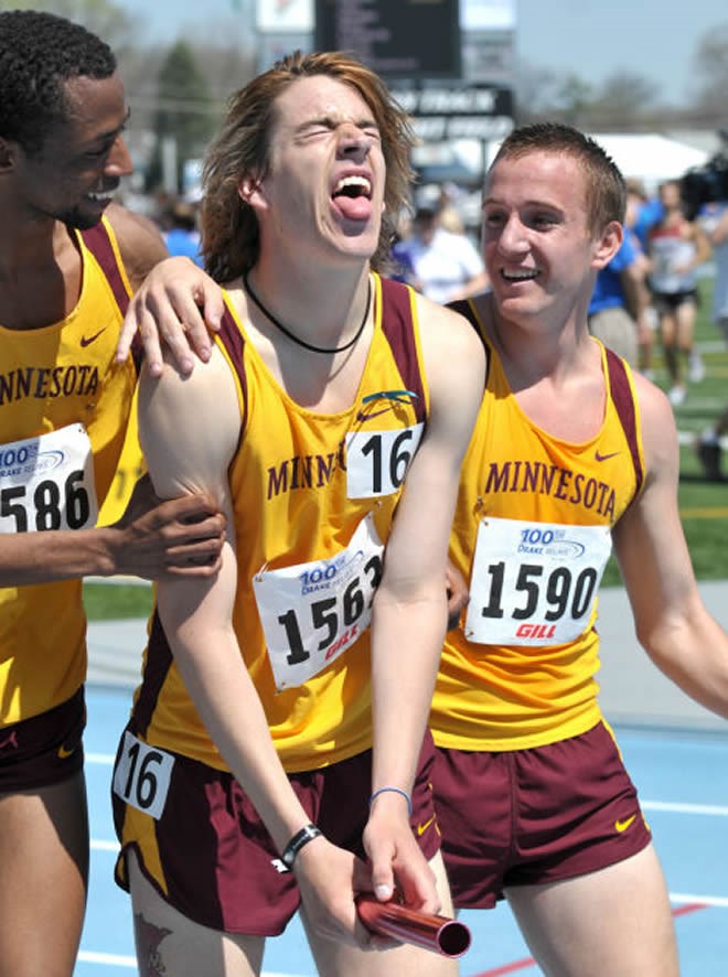 Hassan Mead (left) celebrates with University of Minnesota teammates after winning a race at the Drake Relays, 2009. Photo credit: Steve Pope/AP