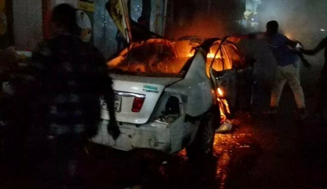 Rescue crews try to extinguish flames from a car. 11 people are reported injured after a car fitted with explosives was detonated at a busy intersection in Mogadishu on Nov 2, 2017. PHOTO: Abdifatah Mohamud