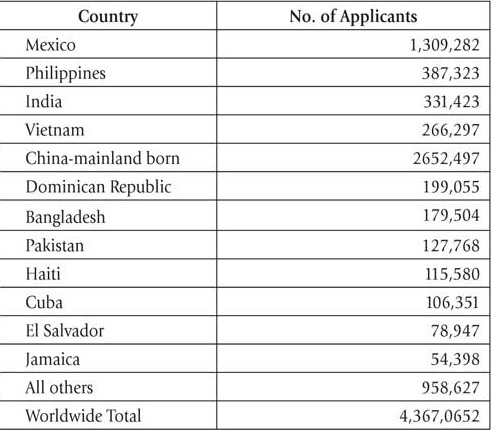 Applicants from these 12 countries represent 88 percent of the total despite a 25,620 per-country limit. The reason for this is that nationals from these countries who have obtained US citizenship may petition the spouse, minor child and parent without regard to the yearly quota. Hence, the 1 million immigrants admitted to the US on the average every year.