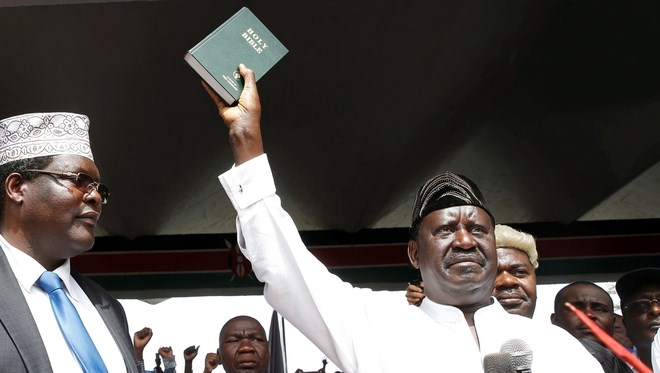 Kenyan opposition leader Raila Odinga of the National Super Alliance (NASA) holds a bible as he takes a symbolic presidential oath of office in Nairobi, Kenya January 30, 2018. REUTERS/Baz Ratner.