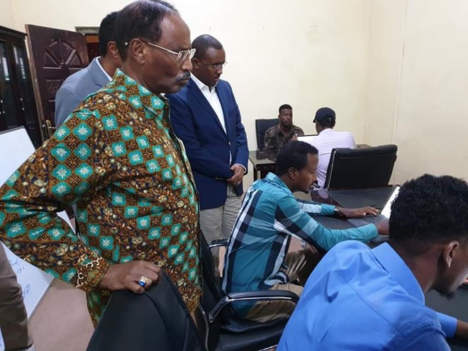 Somali Minister of Finance, Abdirahman Duale Beileh tours a biometric registration centre for soldiers in Mogadishu on Friday, March, 29, 2019.