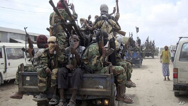 FILE - Al-Shabab fighters display weapons as they conduct military exercises in northern Mogadishu, Somalia.