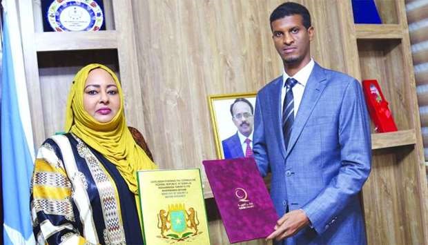 Somalia's Minister of Energy and Water Resources Fawzia Mohamed Sheikh, and Director of Qatar Charity's office in Somalia Abdulnour Haj Ali after signing the agreement.