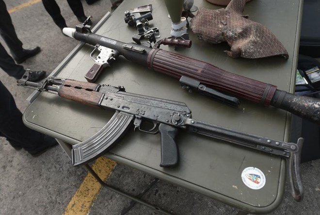 A photo shows a AK47 Kalashnikov assault rifle and a RPG-7 Kalachnikov grenade launcher on display during a visit at French army 4th Special Forces Helicopter Regiment (4th RHFS) on June 13, 2019 in Pau, southwestern France. (Photo by IROZ GAIZKA / AFP) (Photo credit should read IROZ GAIZKA/AFP via Getty Images) AFP VIA GETTY IMAGES