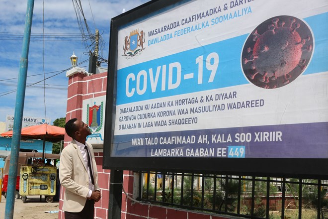 The Somali authorities have ramped up a national public information campaign on COVID-19, using both traditional and new ways of reaching the public. This includes using radio, billboards and outdoor posters to alert and inform citizens about coronavirus symptoms and preventive measures and guidelines, as well as social media platforms. Shown here, a man reads COVID-19 awareness messages on a billboard at the KM 4 junction in Mogadishu.