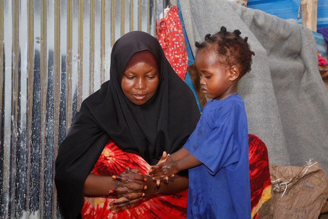 Responding to COVID-19 is an individual and group effort. Shown here, Abshiro Shamsi Salah of Koshin village in Belet Weyne, Hirshabelle state of Somalia, teaches her young daughter to wash her hands. "I constantly teach my daughter how to wash hands in the recommended way. I do this to protect my family. When the first case of COVID-19 was reported in Somalia, we did not leave our house for a month because we were afraid. To keep myself updated about the virus, I listen to the radio and follow the advice of health officials," says Abshiro.