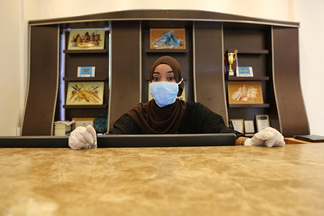 Along with restaurants and eateries, the Somali hotel sector is also greatly impacted by the COVID-19 pandemic, with less travel meaning less need for rooms. Shown here, a woman wearing a safety mask and gloves attends the reception counter of a hotel in Mogadishu.