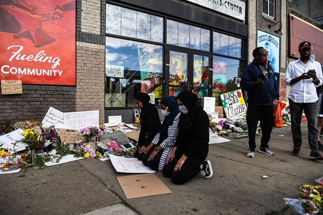 Muslim women offer evening prayers at the makeshift memorial in honor of George Floyd, on June 4, 2020 in Minneapolis, Minnesota. Photo: Chadan Khanna/AFP/Getty Images