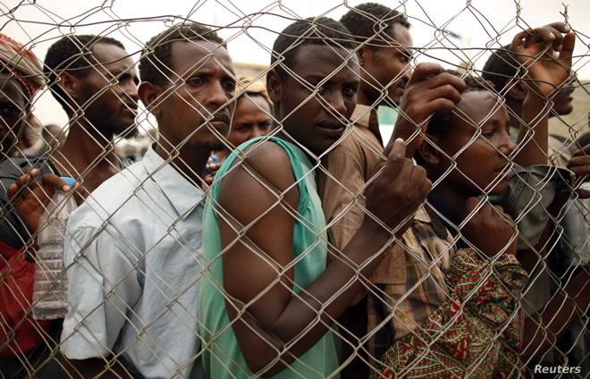 Ethiopia migrant workers seeking jobs in Saudi Arabia are being turned back on March 16, 2012, in Haradh, a town in western Yemen near the site where the Saudi government is erecting a fence along the border. (Reuters)