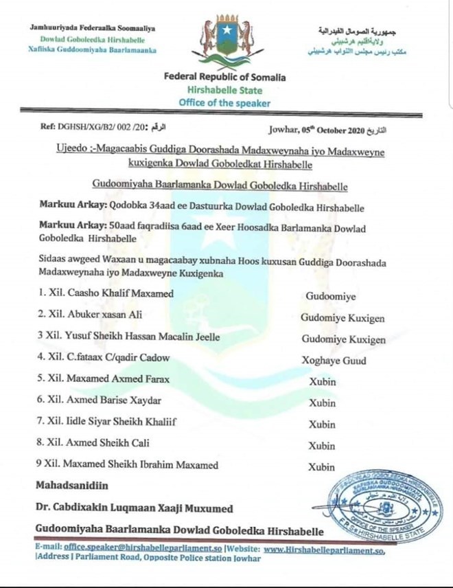 Jowhar (HOL) - Hirshabelle's newly elected speaker of parliament, Abdihakim Luqman Haji Mohamed has announced the formation of the nine-member regional presidential electoral commission.