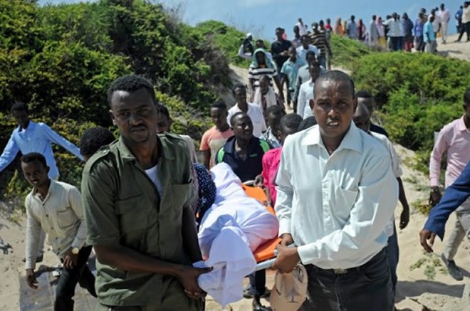 Relatives and fellow journalists carry the body of Somali journalist Abdulaziz Ali Haji during his funeral , on September 28, 2016, in Mogadishu. Credits: MOHAMED ABDIWAHAB / AFP