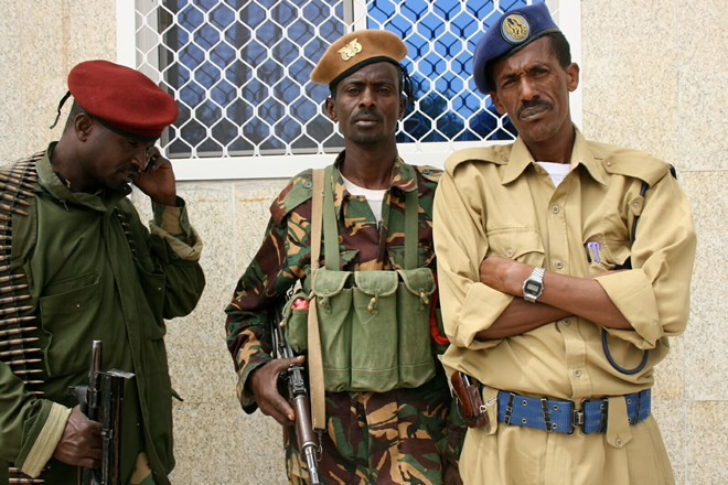 Guards remain vigilant at the 2010 Somaliland presidential inauguration./Teresa Krug