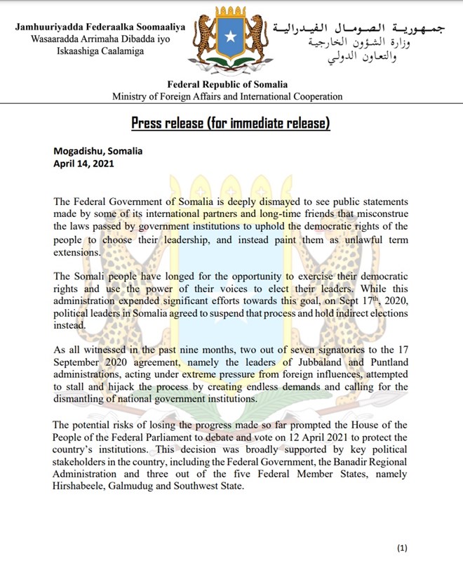 "As all witnessed in the past nine months, two out of seven signatories to the 17 September 2020 agreement, namely the leaders of Jubbaland and Puntland administrations, acting under extreme pressure from foreign influences, attempted to stall and hijack the process by creating endless demands and calling for the dismantling of national government institutions."