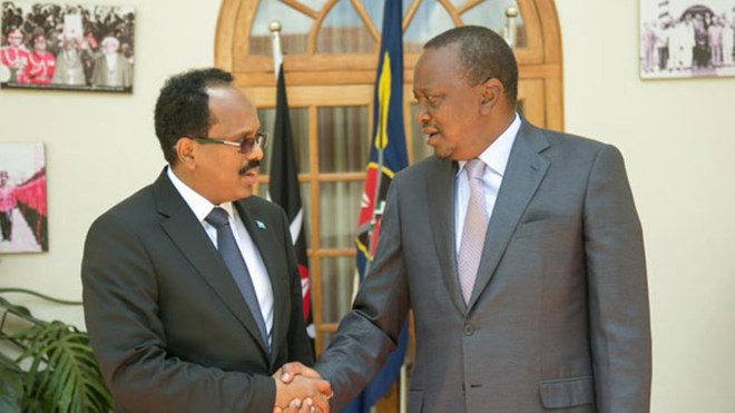 Somalia's President Mohamed Abdullahi Mohamed with Kenya's President Uhuru Kenyatta at State House, Nairobi, on March 23, 2017.