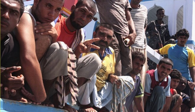 Iranian fishermen crouch on the deck of their vessel after being detained for illegally fishing in Somali waters. REUTERS