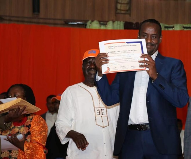 ODM leader Raila Odinga awarded Adow his certificate to clinch the seat held by Mohamud Mohamed Sheikh.