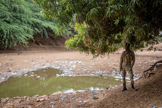 A soldier stands in front of the dried up Jubba River near the Ethiopian border. (Sally Hayden/Sopa Images/LightRocket via Getty Images)