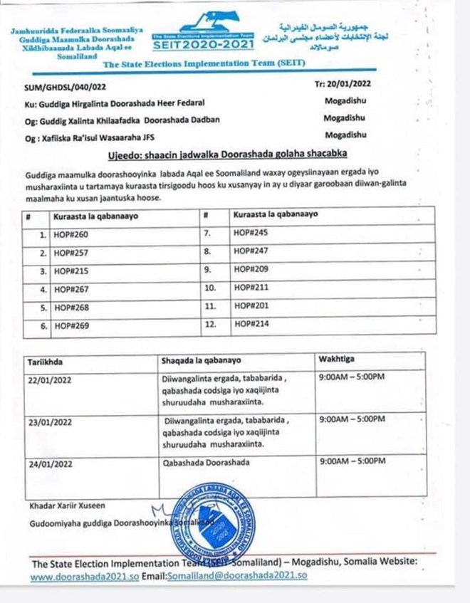 The Northern Region of Somaliland’s State Election Implementation Team also announced on Friday that they had scheduled elections for 12 seats for the incoming federal parliament.