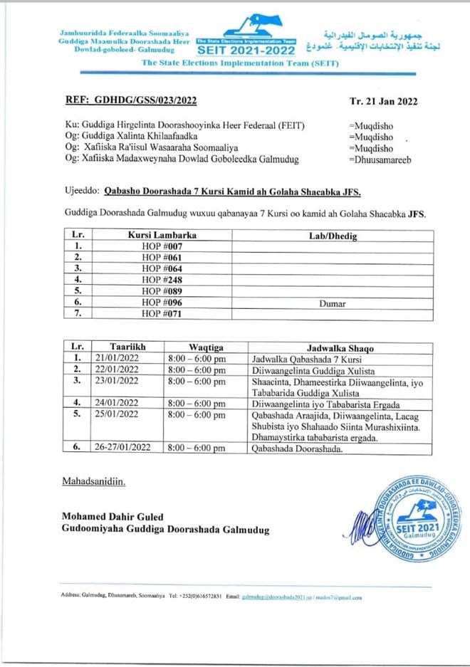 The seats announced by the Galmudug electoral commission are HOP07, HOP61, HOP64, HOP248, HOP89, HOP96 and HOP71