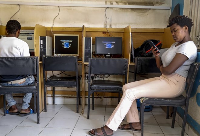 A customer uses her mobile phone at an internet cafe in the Kibera neighborhood of Nairobi, Kenya, on Sept. 29, 2021. (Brian Inganga / Associated Press)