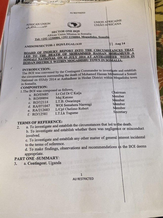 The documents show a probe conducted by a six-member board from the African Union investigating the death of 20-year-old Mohamed Hassan at the hands of coalition troops.