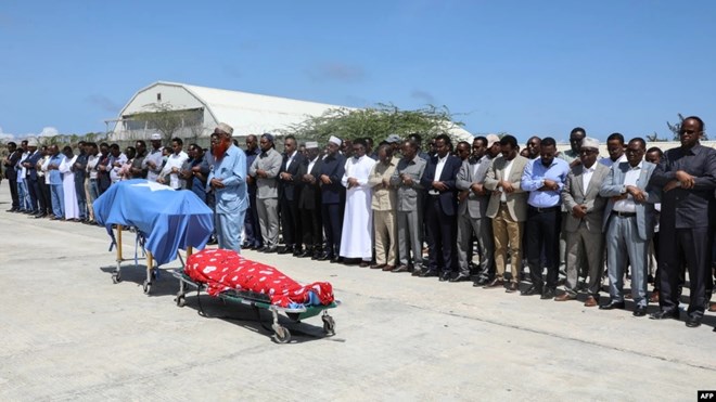 Political leaders pray in front the two bodies of the local lawmakers including Amina Mohamed Abdi after being airlifted from Beledweyne, at Aden Adde International Airport in Mogadishu, Somalia, on March 24, 2022.