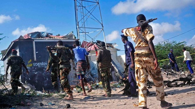 Members of the Somali military walk at the site of a past car bomb attack by suspected Al-Shabaab militants. Somalia on November 9, 2022 announced it had deactivated hundreds of media sites it said were propagating Al-Shabaab narratives in the latest clampdown on violent extremism. PHOTO | MOHAMED ABDIWAHAB | AFP