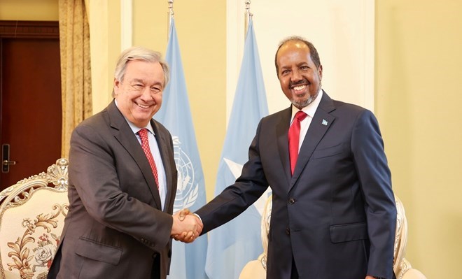 Mogadishu (HOL) - Somali President Hassan Sheikh Mohamud met with United Nations Secretary-General António Guterres on Tuesday at the Presidential Palace in Mogadishu.
