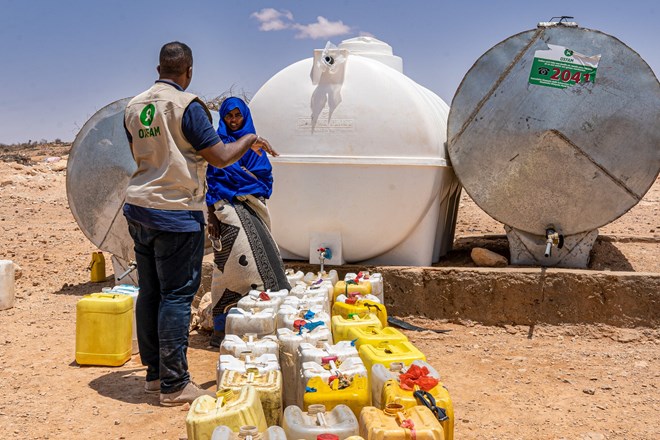 Hibo, a member of one of the committees in charge of water at the camp for displaced people at Karasharka, explains how they organize water distribution. Abdilahi Persia/Oxfam