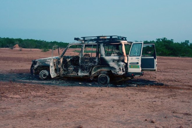 The wreckage of the car where aid workers, their local guide and the driver were killed by unidentified gunmen in Niger in 2020. Photographer: Boureima Hama/AFP/Getty Images