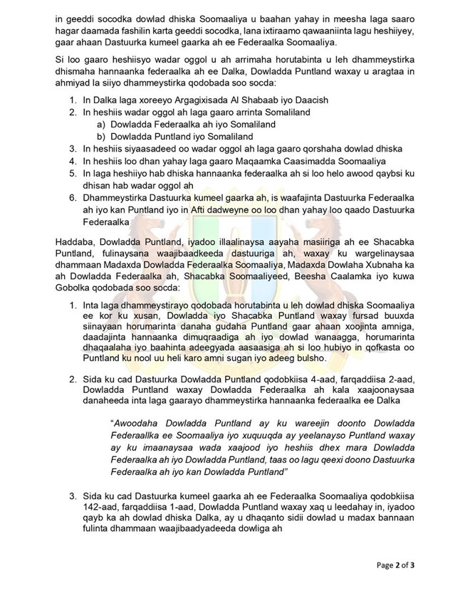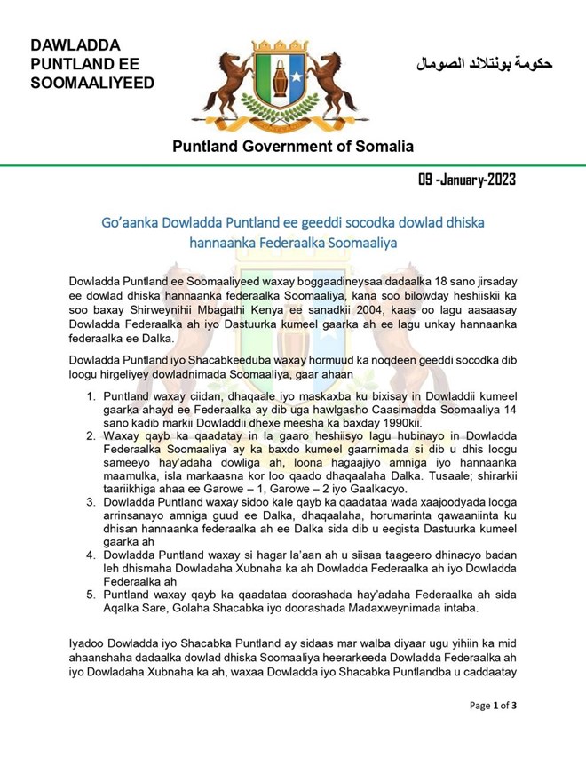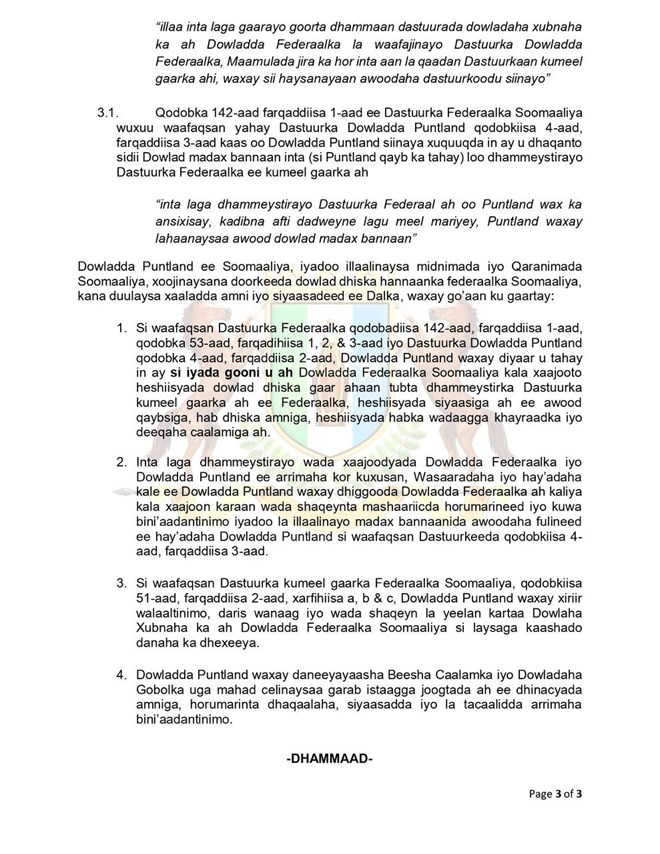 According to the statement, Puntland will continue cooperating with other Federal Member States. It added that it will allow its ministers to collaborate with their FMS counterparts on development and humanitarian projects.Puntland said that the federal government should prioritize liberating the country from Al Shabaab and other insurgency groups as well as settle the long standing political questions in Somaliland and Puntland before finalizing Somalia's federal system.