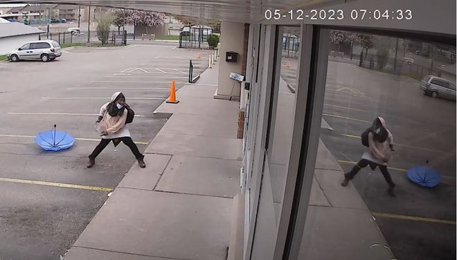 In the video, a male wearing a mask and holding an umbrella walked toward the mosque, picked up a large rock and threw it at the front doors three times.