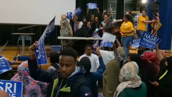 Warsame, wearing a gray suit, can be seen in the video leaning against a wall by himself — arms crossed or hands in pockets — as his supporters begin to storm the stage. At one point, he begins recording the mayhem with his cellphone. At least three minutes pass before he goes to the stage, raises his arms and tries to calm his supporters — to little avail.