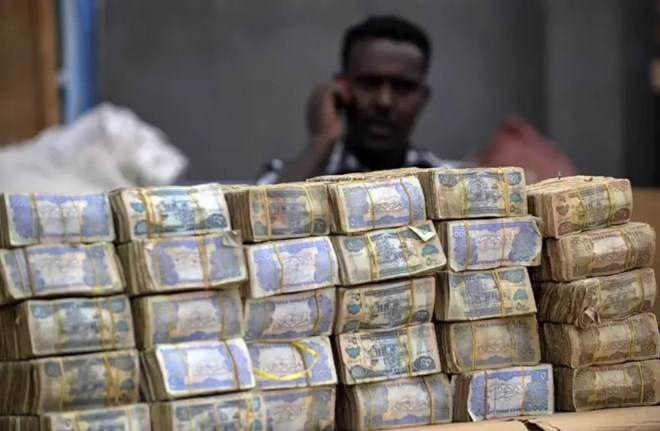 Stacks of Somali shillings are displayed at a currency exchange market in Mogadishu, Somalia, as a trader speaks on the phone. The country's economy has been struggling with high inflation and unemployment, impacting the livelihoods of many citizens. (AFP/Getty Images)