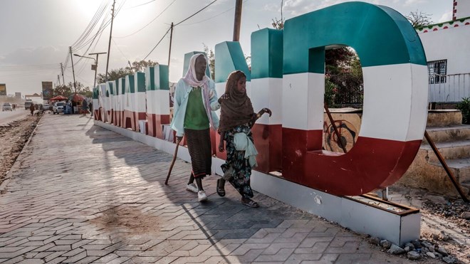 A blind man guided by a girl walk in front of a sign, in the city of Hargeisa, Somaliland, on September 16, 2021. - For 30 years, Somaliland has tried unsuccessfully to convince the world of its case for statehood, holding democratic elections and avoiding the anarchy that engulfed the rest of Somalia. — EDUARDO SOTERAS/AFP via Getty Images