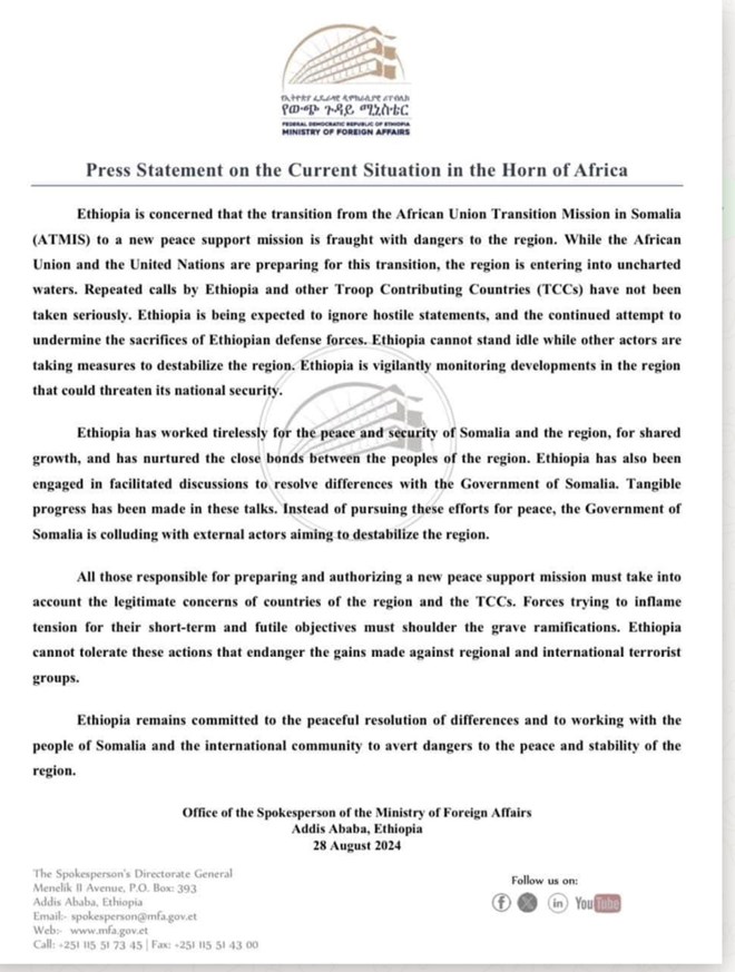 The Ethiopian Foreign Ministry statement, released on Wednesday, comes after Somalia’s Prime Minister Hamza Abdi Barre declared last week that Ethiopian forces would not be part of the AUSSOM unless Ethiopia withdraws from a controversial memorandum of understanding (MoU) signed with Somaliland earlier this year.