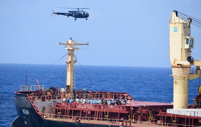 This picture shared by the Indian Navy on the X platform on March 16, 2024 shows people on board of the recaptured Maltese ship the MV Ruen, as an Indian Naval helicopter flies overhead. (PHOTO / INDIAN NAVY X VIA AFP)