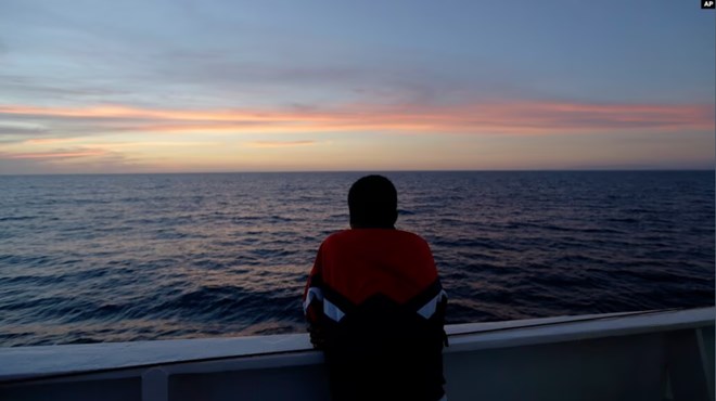 FILE - Somali migrant Amsa, 16, last name not available, watches the sunset as he stands aboard a ferry leaving the Sicilian Island of Lampedusa, Oct. 7, 2013.
