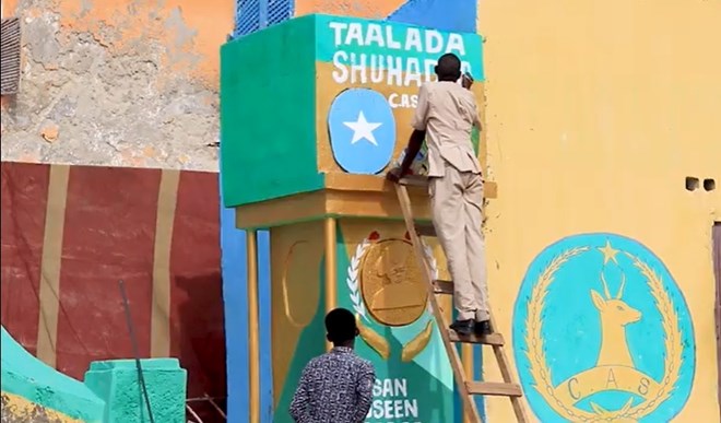Workers finalize the construction of a monument at Mogadishu's Central Prison to honor the soldiers who lost their lives during the recent attack by al-Shabaab militants. CREDIT / SONNA