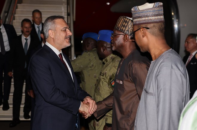 Local officials welcome Foreign Minister Hakan Fidan (L) at the airport, Niamey, Niger, July 17, 2024. (AA Photo)