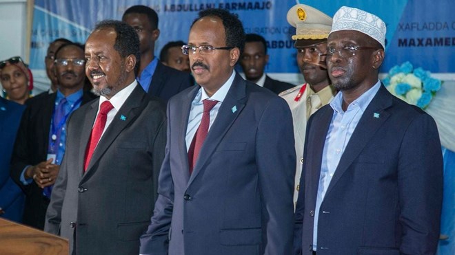 Former Somali president Mohamed Abdullahi Farmaajo (C) with his predecessors Sharif Sheikh Ahmed (R) and current President Hassan Sheikh Mohamud (L). PHOTO | FILEE | NMG