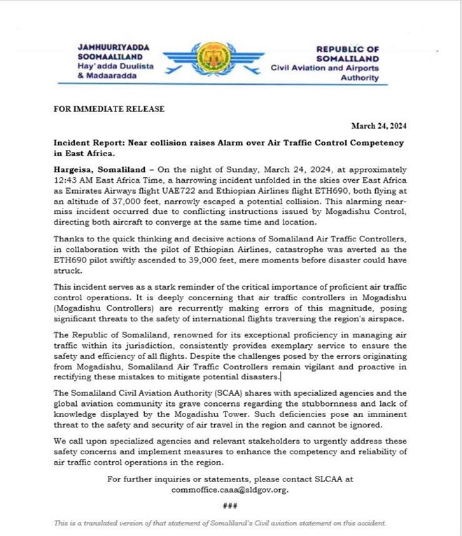 Mogadishu (HOL) - The Somaliland Aviation Authority has again levelled accusations against Mogadishu's air traffic controllers after an alleged near-collision between Emirates Airways and Ethiopian Airlines on March 24, 2024. According to the Somaliland Civil Aviation and Airports Authority's press release, the two aircraft "narrowly escaped a potential collision" due to "conflicting instructions issued by Mogadishu Control, directing both aircraft to converge at the same time and location."