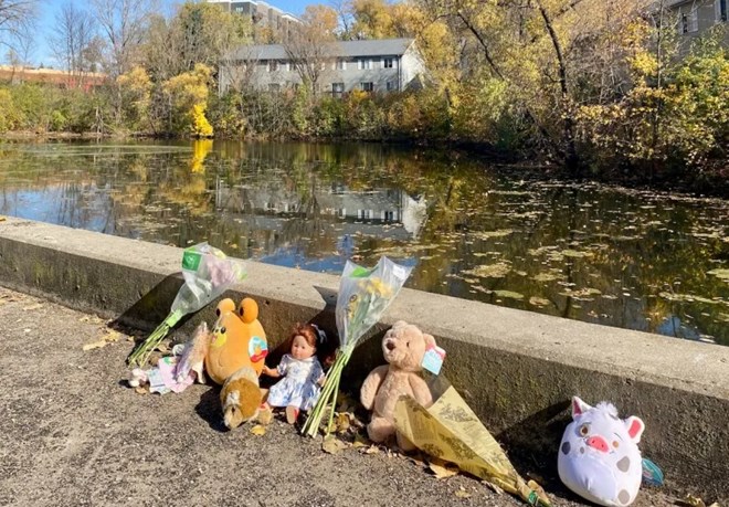 Flowers, dolls, and stuffed animals form a small memorial overlooking the Cardiff Lane pond in Eden Prairie, where 11-year-old Mohamed Mohamed drowned on Oct. 20. Photo by Stuart Sudak