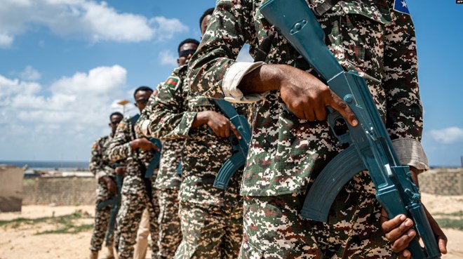 FILE - Troops take part in Somali army training in Mogadishu on March 19, 2024. Two government soldiers are among the 12 dead in fighting with local militias near the border with Ethiopia on July 16, 2024.
