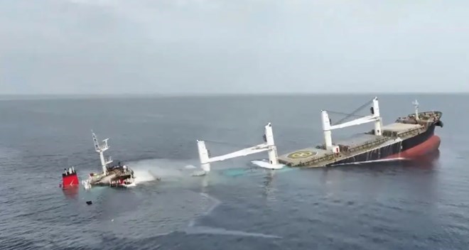 Aerial image shows the Liberia-flagged bulk carrier MV Eternity C sinking in the Red Sea after being struck by Houthi sea drones and rocket-propelled grenades on July 7–8, 2025. The vessel had departed Somalia after delivering food aid for the United Nations World Food Programme. At least four crew members were killed and several others remain detained by the Houthis.