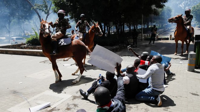 Videos also showed police attempting to break up the sit-in protest by throwing multiple tear-gas canisters towards the cowering demonstrators. Once the smoke cleared, police arrived on horseback and were seen handling several of the protesters, including Omtatah.