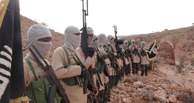 Armed fighters of the Islamic State Somalia Province (ISS) stand in formation in the rugged terrain of northern Somalia, reflecting the group's growing presence and operational sophistication in the region.