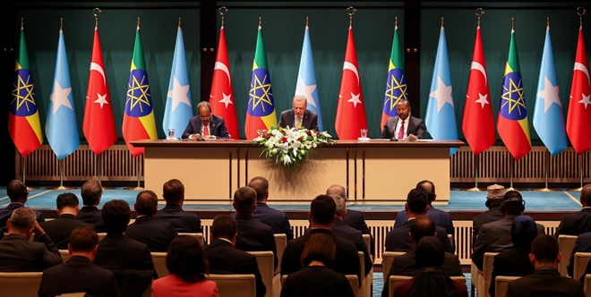 Turkish President Recep Tayyip Erdoğan hosts Somali President Hassan Sheikh Mohamud (left) and Ethiopian Prime Minister Abiy Ahmed (right) during trilateral talks in Ankara, Turkey, aimed at resolving the maritime dispute between Somalia and Ethiopia, December 11, 2024. The high-level meeting concluded with the signing of the Ankara Declaration, pledging continued dialogue over Ethiopia’s bid for sea access via Somaliland. (Photo: Anadolu Agency)
