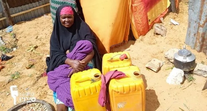 A mother sitting with her empty water containers outside her camp house/File Photo/Ergo